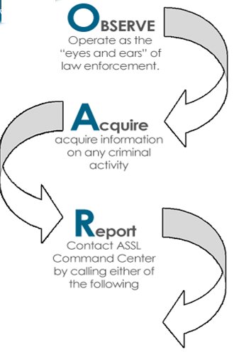For providing that forward thrust to making our community and country a safe place, we have ask our employees to make a 3 key character habitual to their lifestyle as part and parcel of the first line of defense be it at work, home or in the public domain.  These are O.A.R which stands for Observe, Acquire of Report.