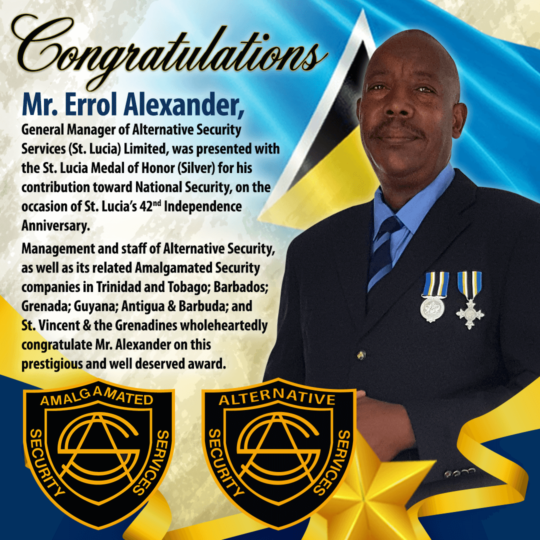 Congratulations Mr. Errol Alexander, General Manager of Alternative Security Services (St. Lucia) Limited, was presented with the St. Lucia Medal of Honor (Silver) for his contribution toward National Security, on the occasion of St. Lucia’s 42nd Independence Anniversary.